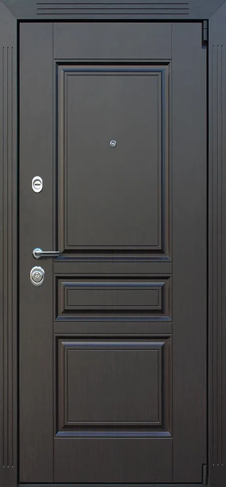 Порошковое покрытие "муар черный". Панель МДФ 16 мм. Объемная фрезеровка. Цвет "венге". Наличник МДФ: толщина 16 мм, ширина 85 мм.